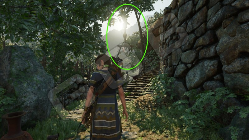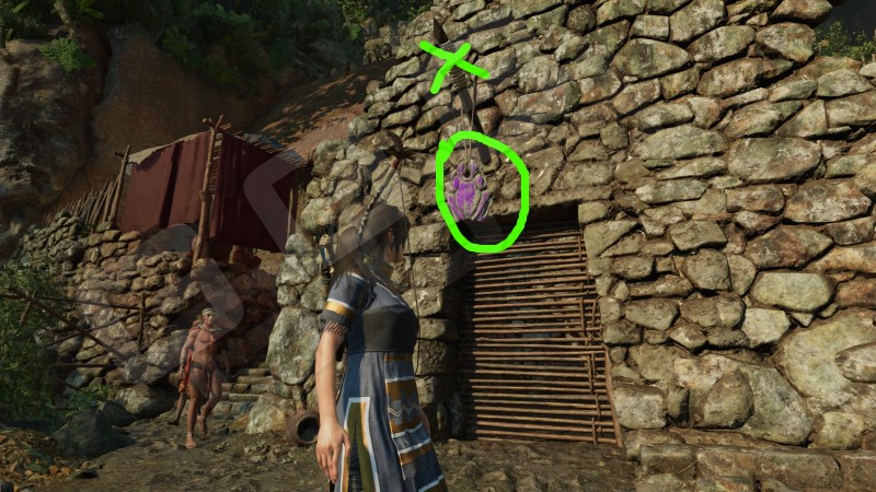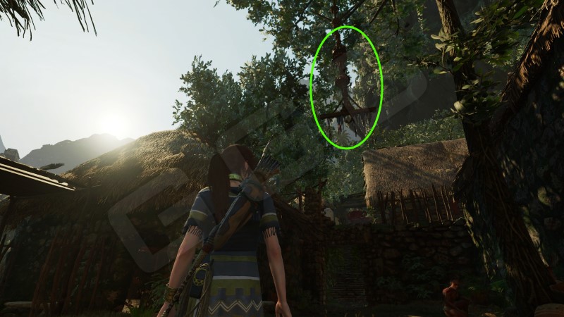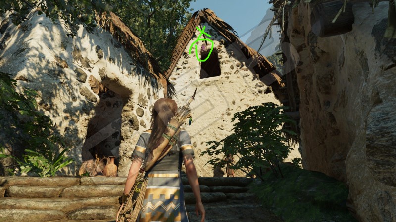Уничтожить пять тотемов жаб. Розовых жаб. Тотемы висят под крышами домов. Задача же Лары выстрелить стрелой по верёвочной обмотке, на которой закреплены тотемы. После чего натянуть веревку и сорвать тотем. Все они находятся практически рядом на домах, под крышами, и даже на одном доме с обеих его сторон. Подробности на карте.