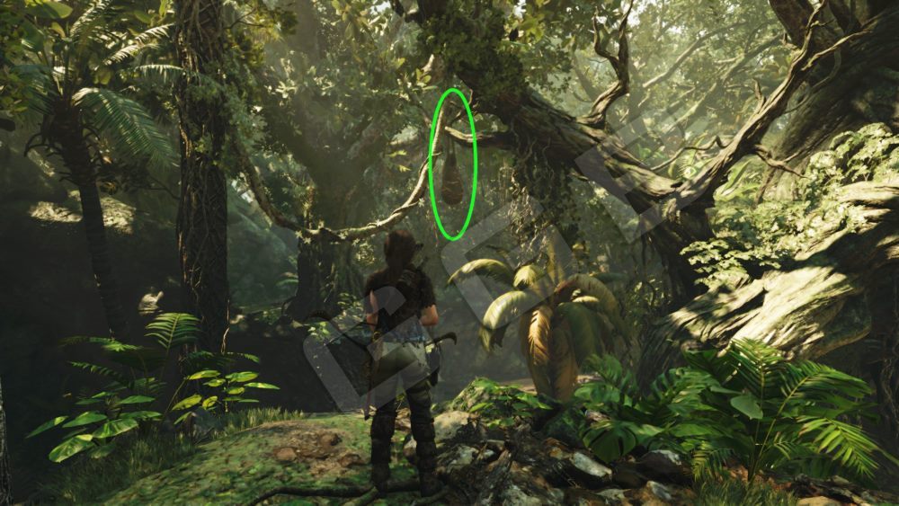 Ваша задача сбить из лука четыре гнезда оропендола. По сюжету, после крушения самолета, Лара будет собирать по джунглям свое снаряжение и, рано или поздно, найдет лук и рацию. Ближайший лагерь: Обломки самолета.