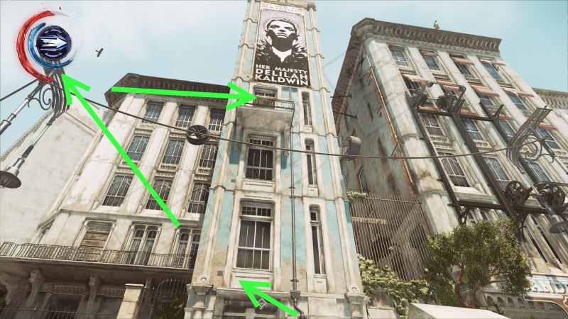 Напротив причала есть здание с плакатом Далилы. под плакатом балкон. С помощью переноса запрыгните на карниз напротив, затем на фонарный столб и оттуда на балкон.