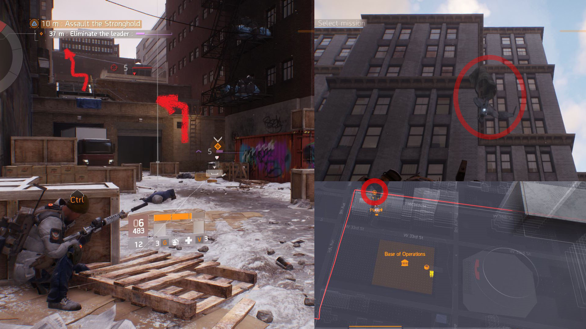 Аэроснимок 1 на севере от базы операций. Поднимитесь по лестнице в точке на карте и увидите сломанный беспилотник, что будет висеть со стороны здания. Снимите его и получите снимок.