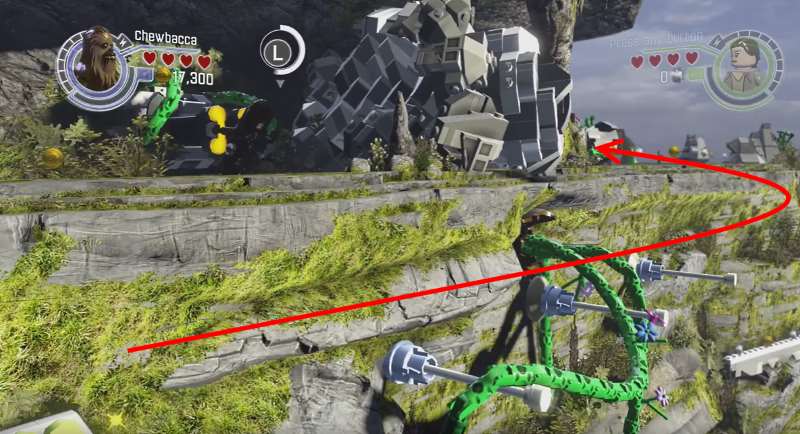 Двигайтесь через остров и достигните небольшого уступа, ход по которому перекрывают скалы. Двигайтесь понизу и залезайте наверх с другой стороны. Здесь увидите мульт-блоки, опутанные лианами и небольшой тайник в пещере. Открыть его можно с помощью Темной стороны Силы, поэтому смените персонажа и разбейте его. Затем пролезьте внутрь и красный блок ваш.