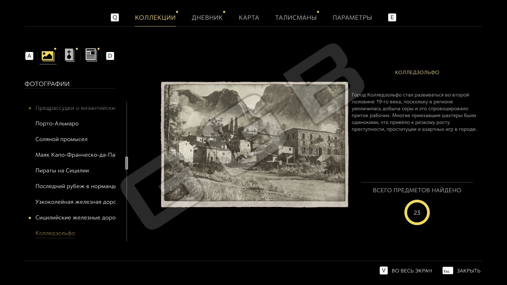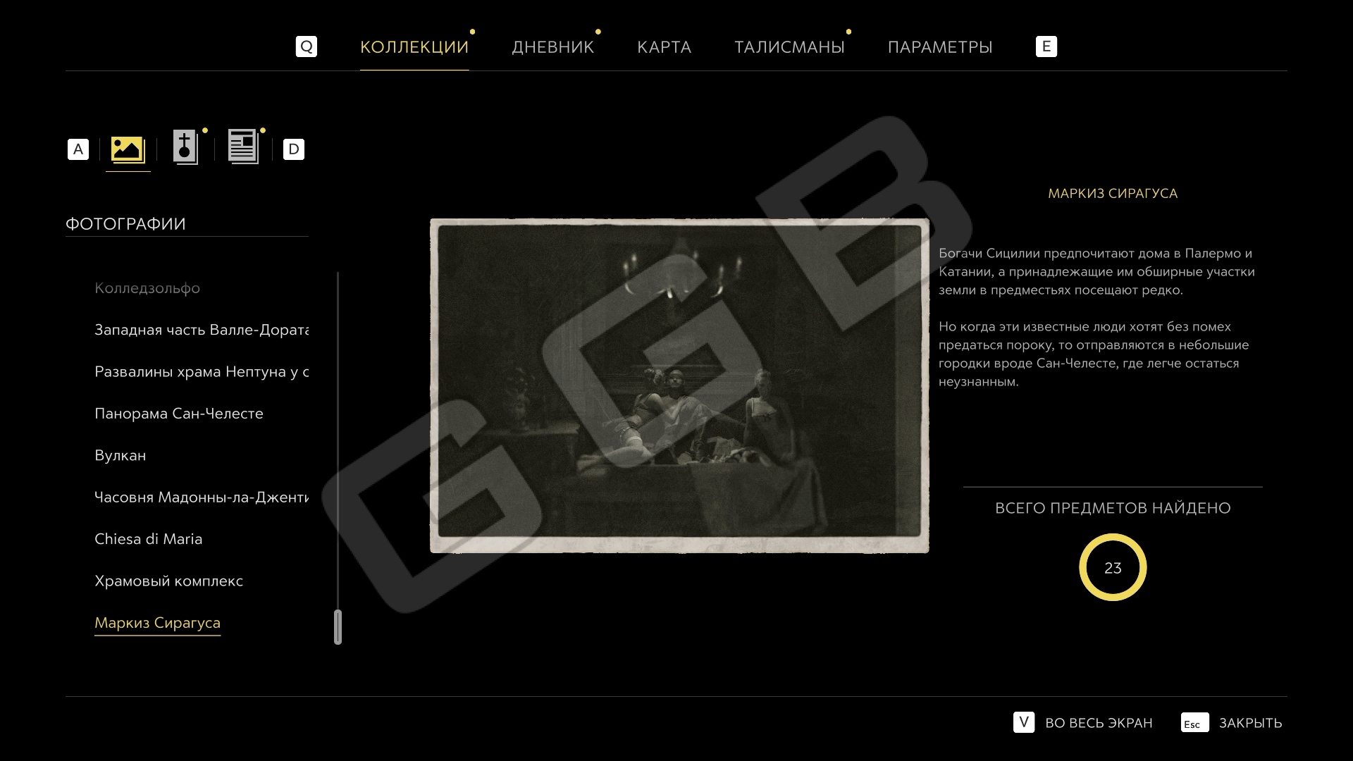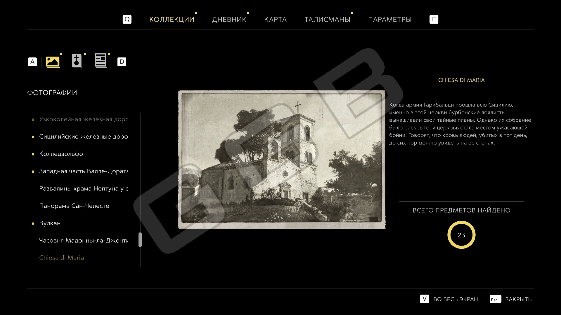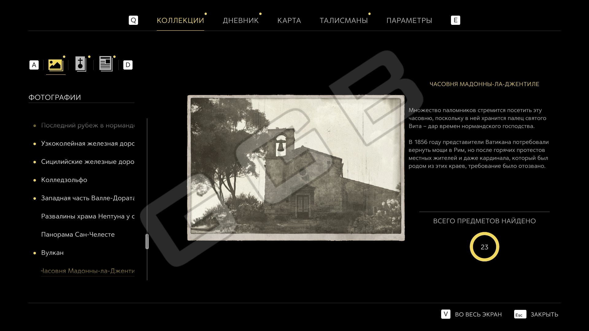Всего в Mafia: The Old Country представлено 23 фотографии на просторах Сицилии. Собрав их все и соединив с другими коллекциями, вы получите достижение/трофей «Коллекционер» The Collector.