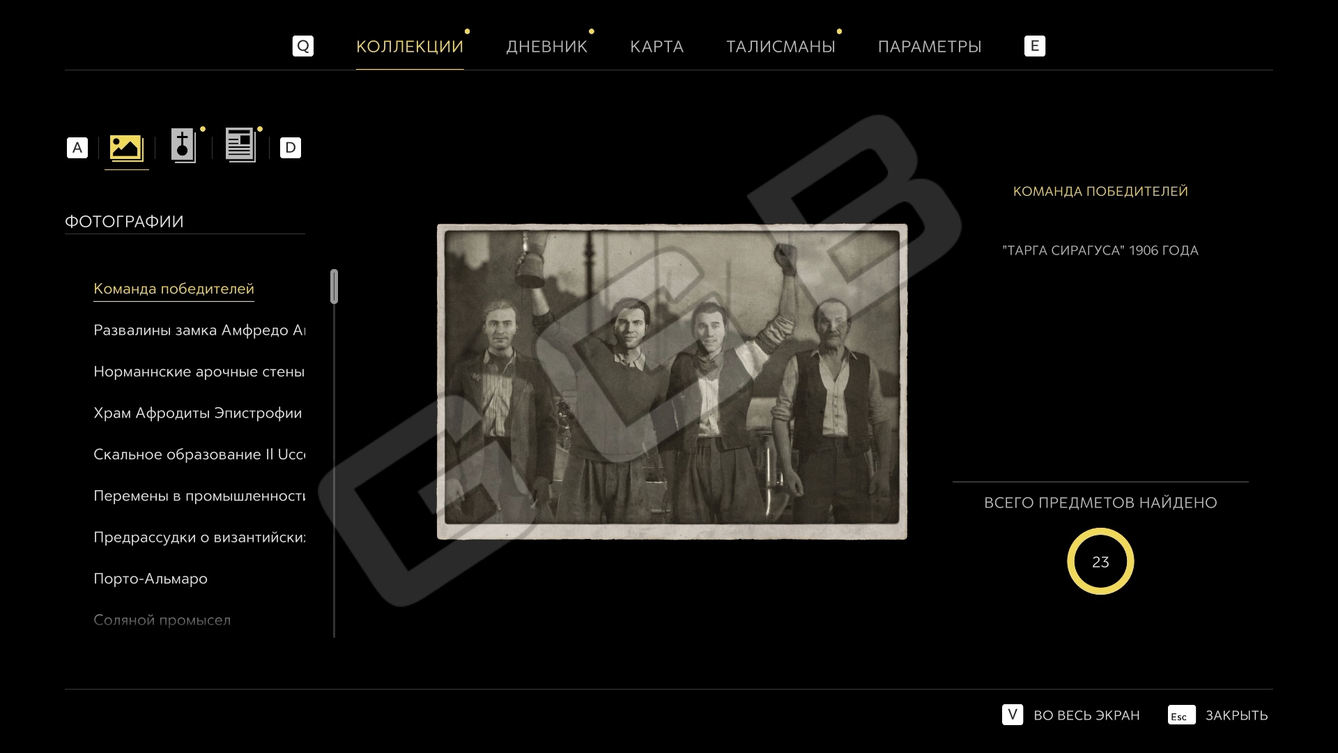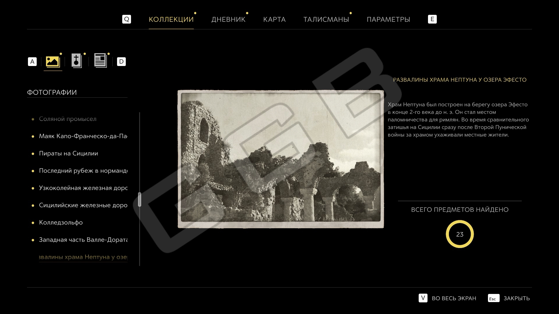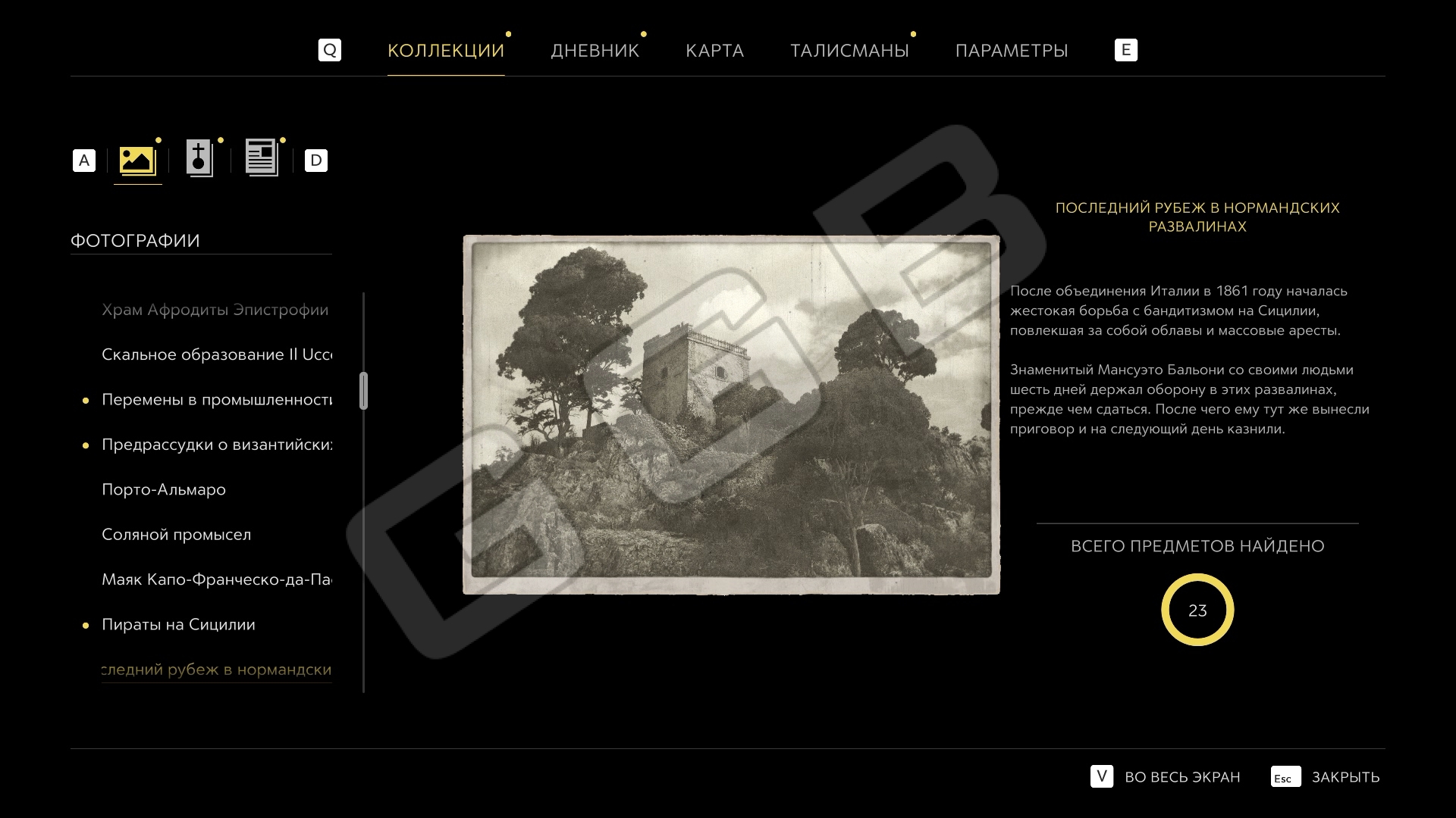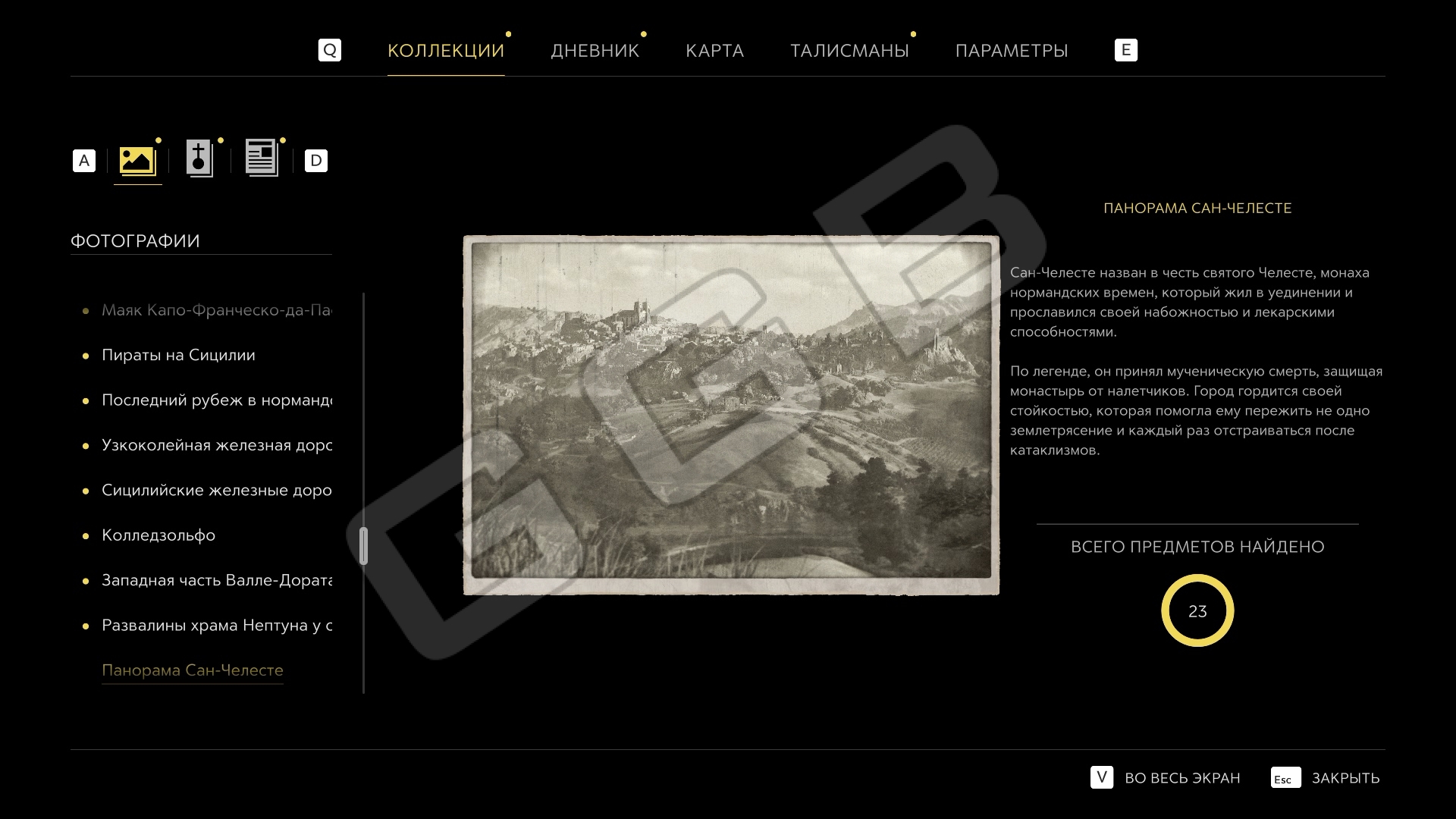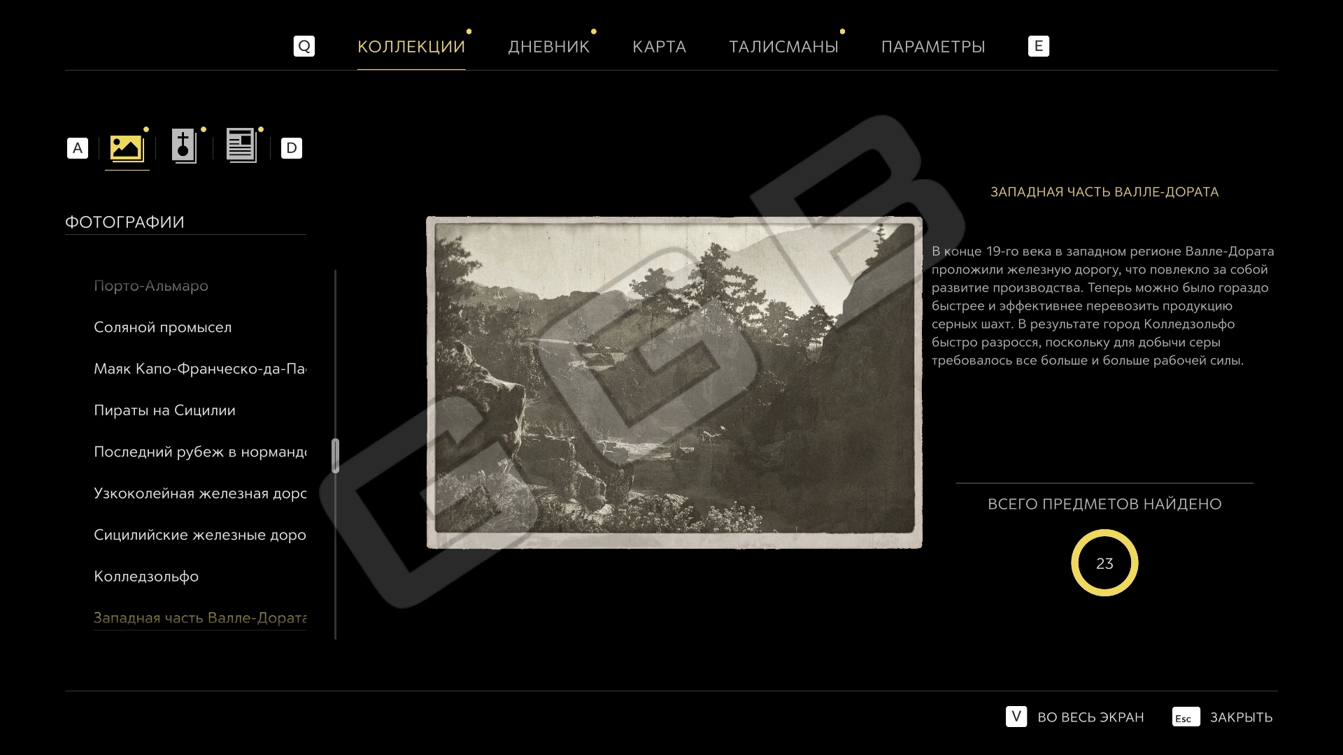 Всего в Mafia: The Old Country представлено 23 фотографии на просторах Сицилии. Собрав их все и соединив с другими коллекциями, вы получите достижение/трофей «Коллекционер» The Collector.