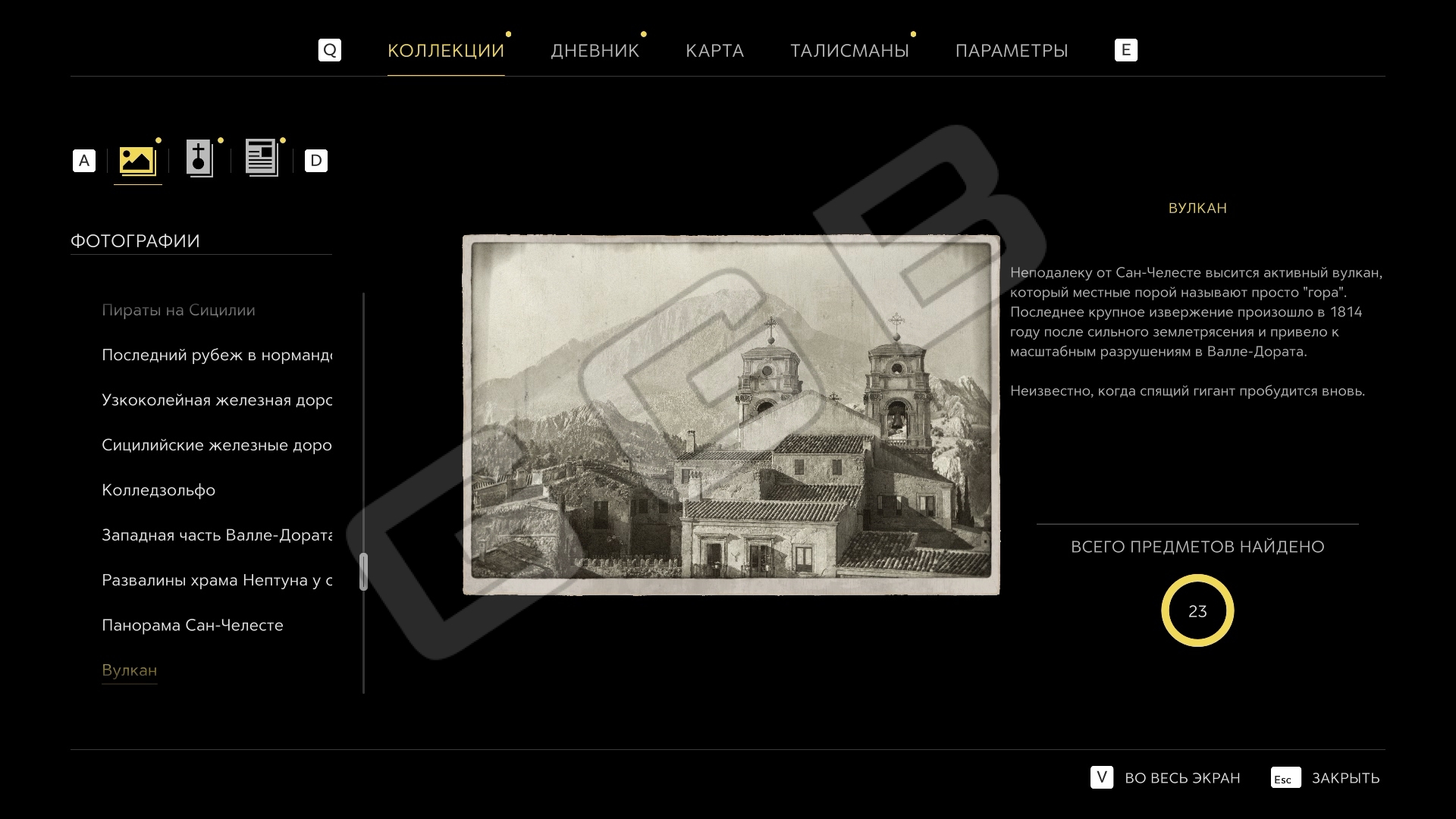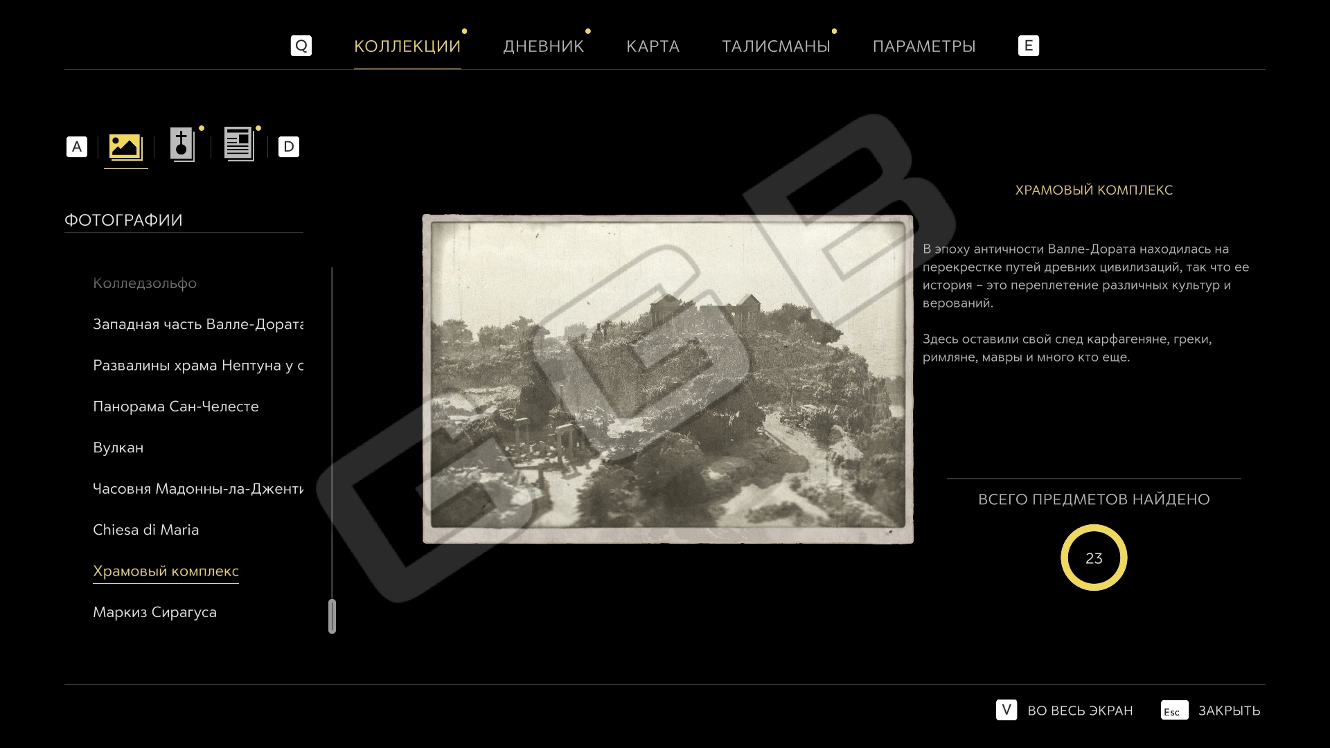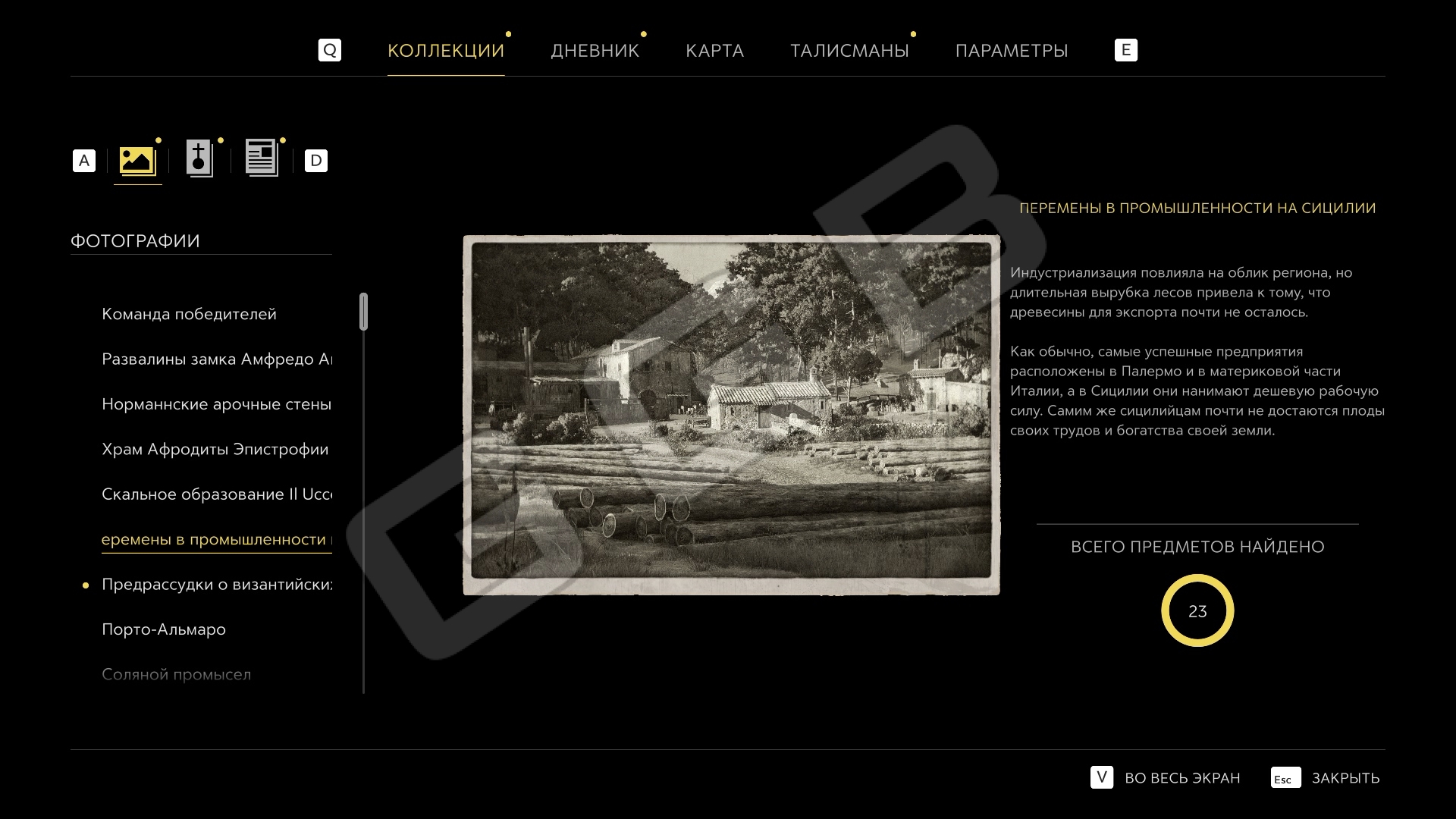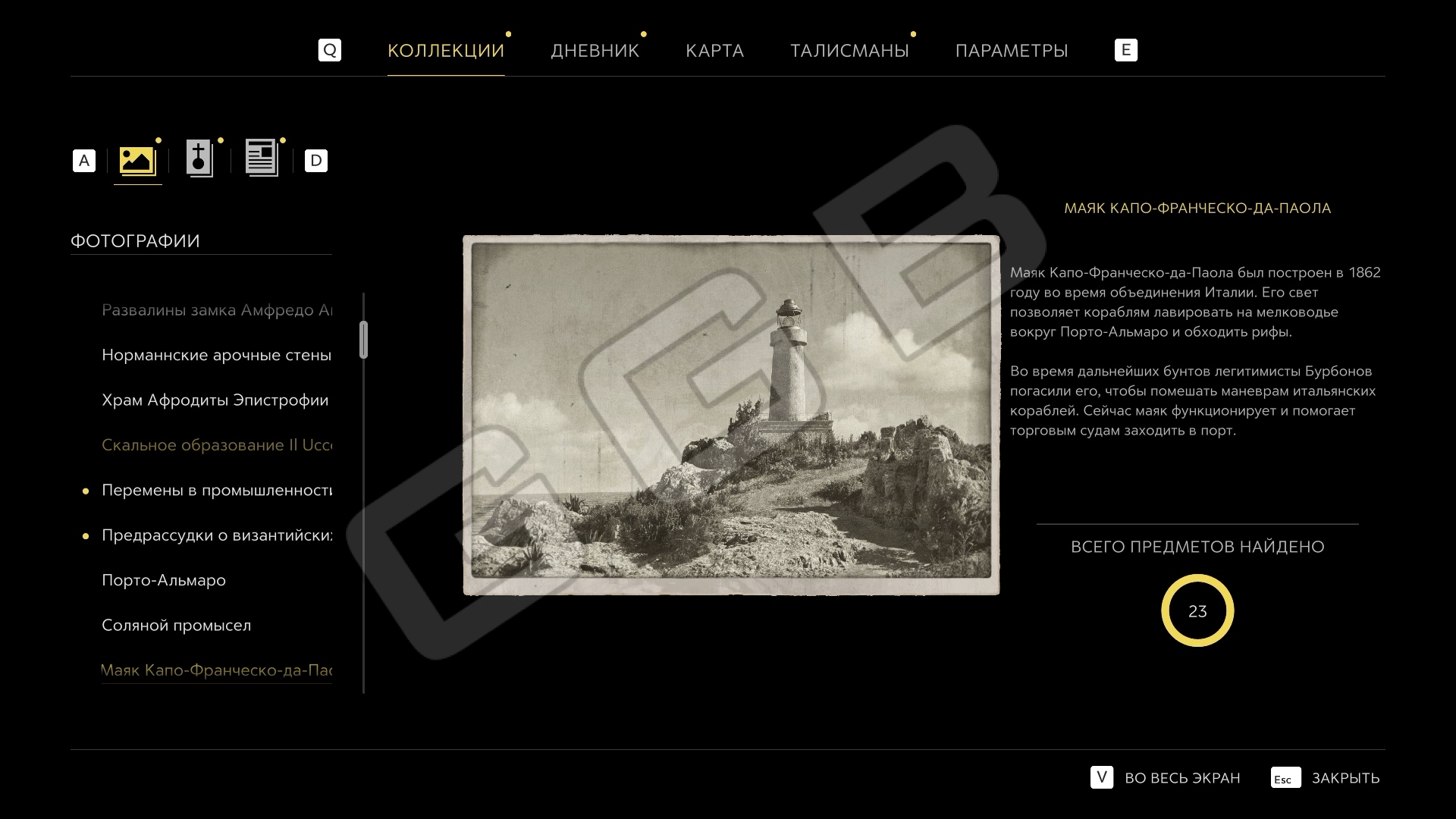 Всего в Mafia: The Old Country представлено 23 фотографии на просторах Сицилии. Собрав их все и соединив с другими коллекциями, вы получите достижение/трофей «Коллекционер» The Collector.