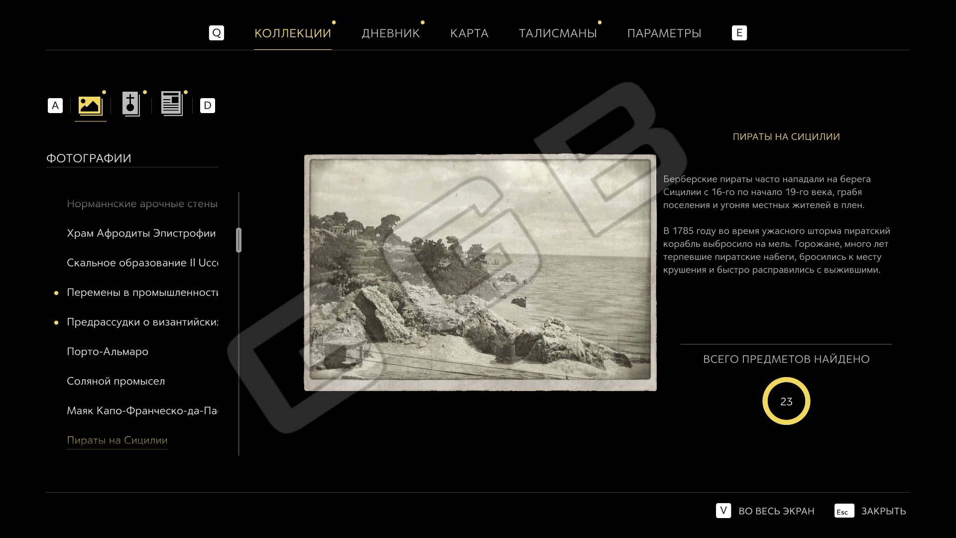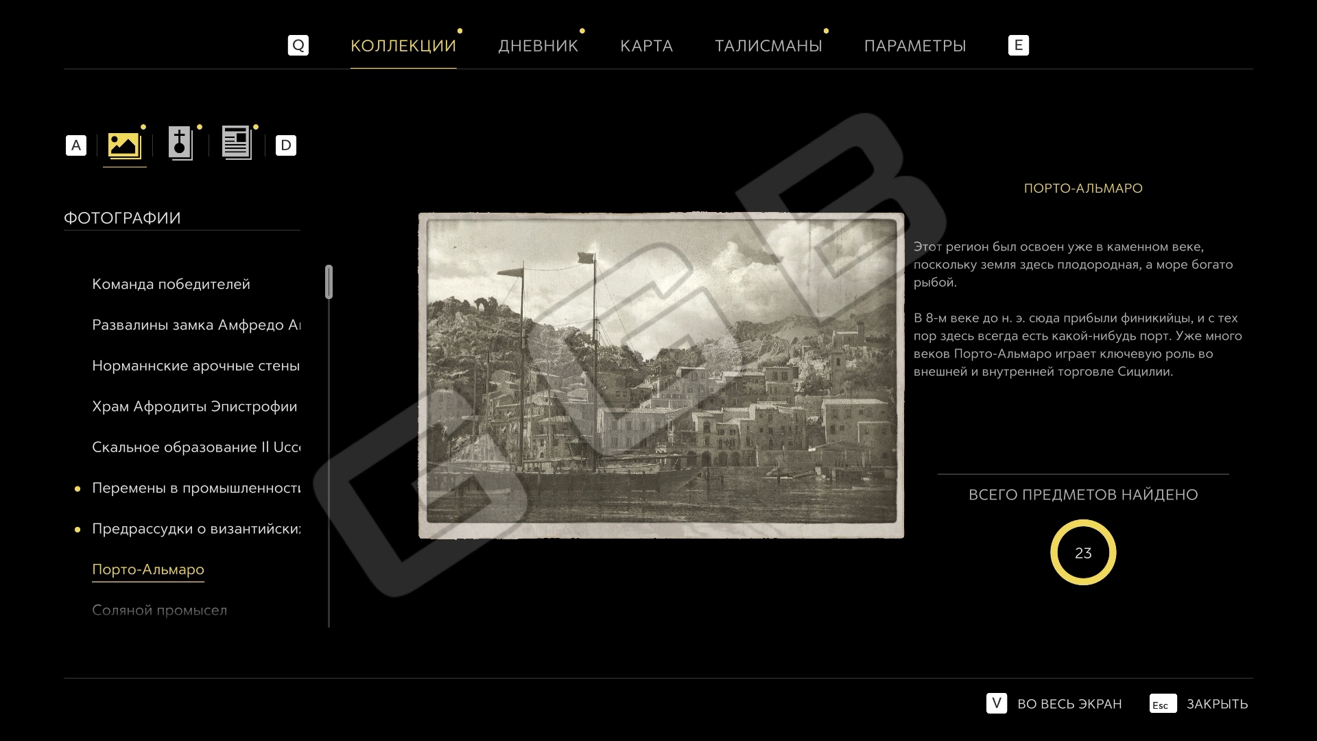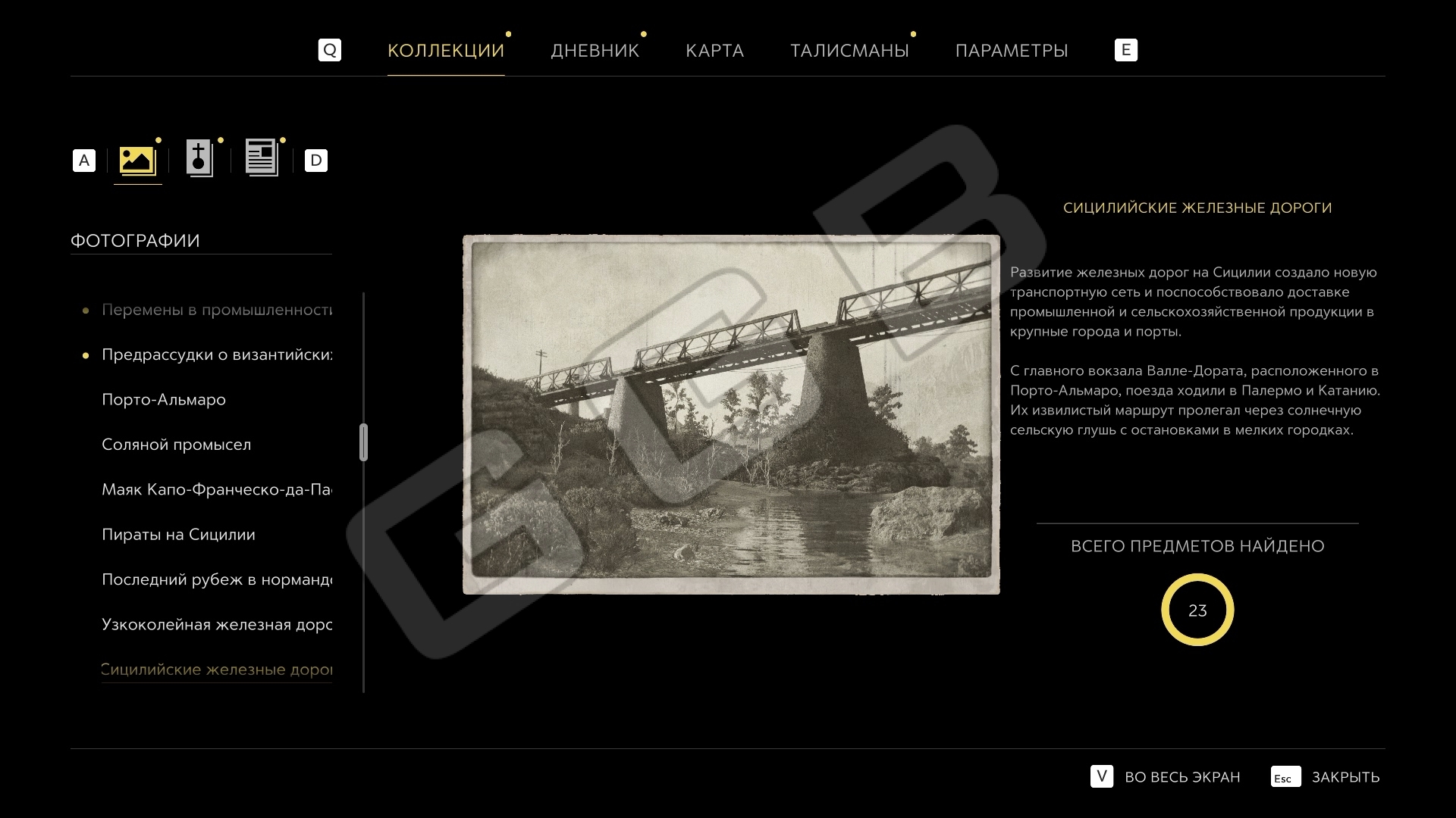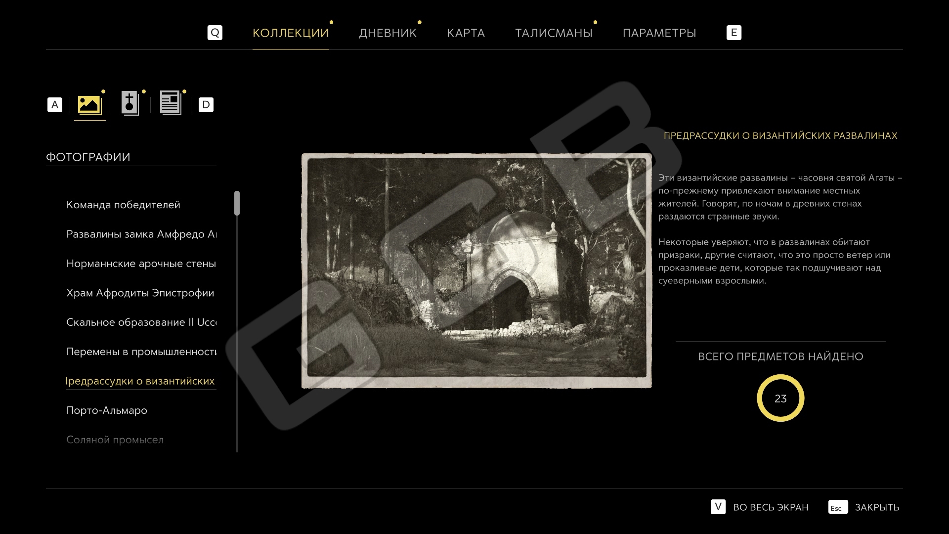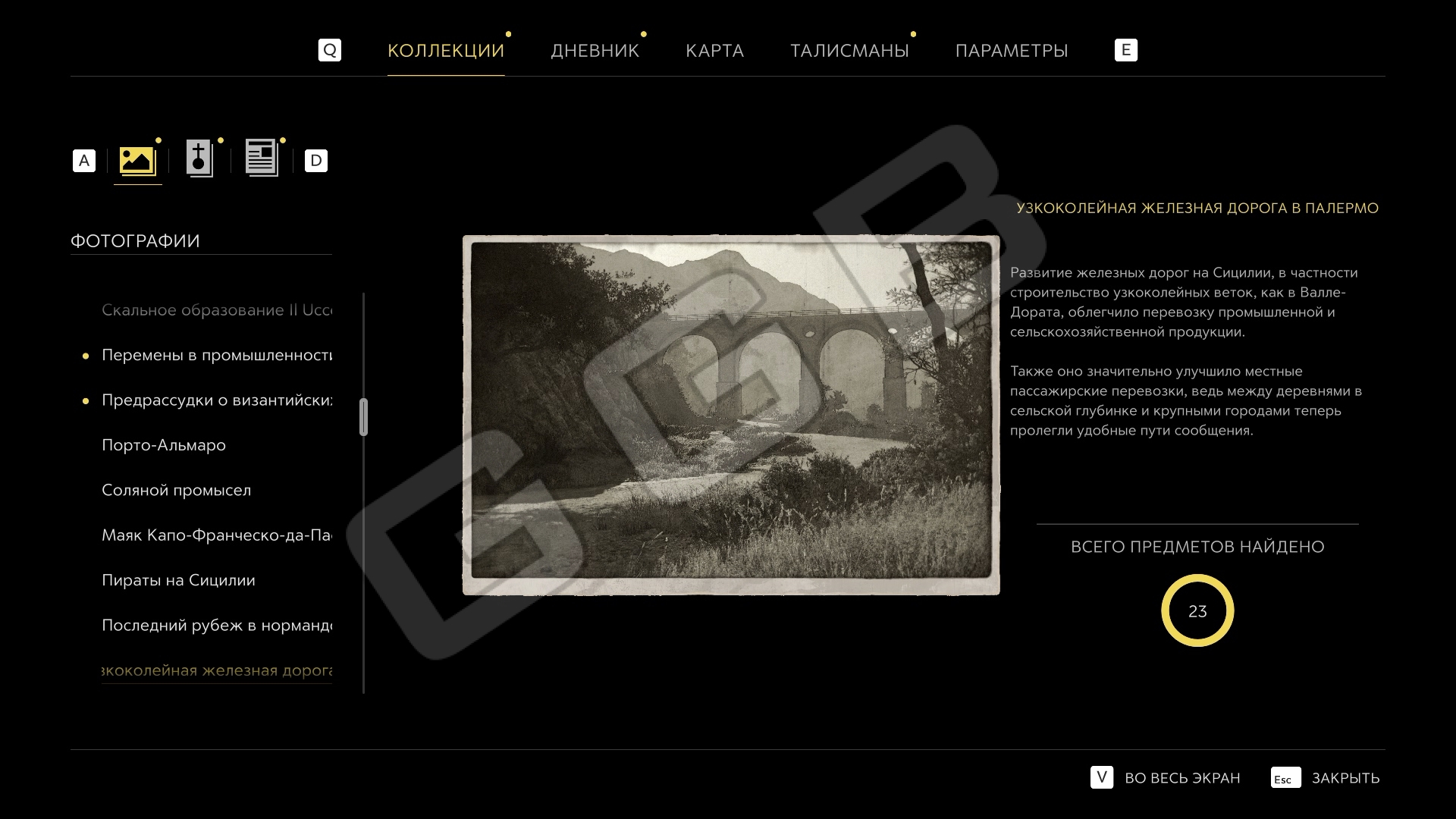 Всего в Mafia: The Old Country представлено 23 фотографии на просторах Сицилии. Собрав их все и соединив с другими коллекциями, вы получите достижение/трофей «Коллекционер» The Collector.