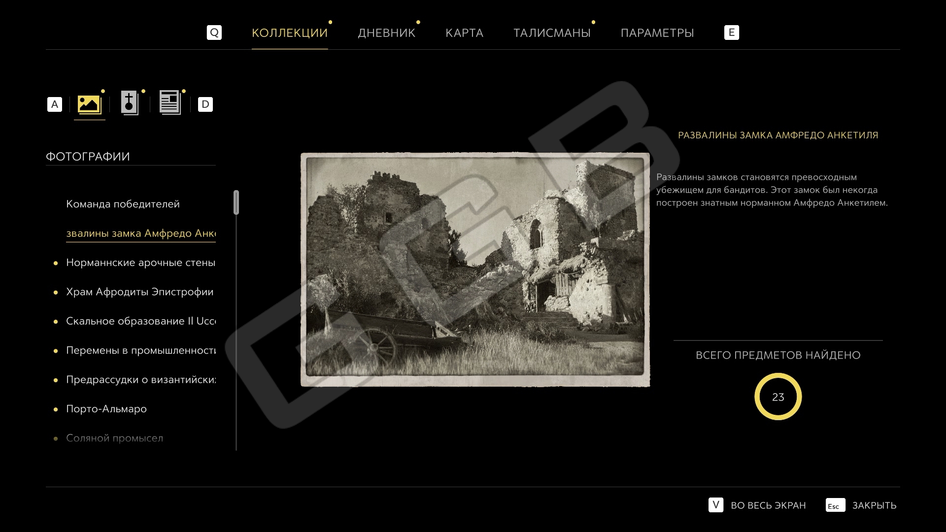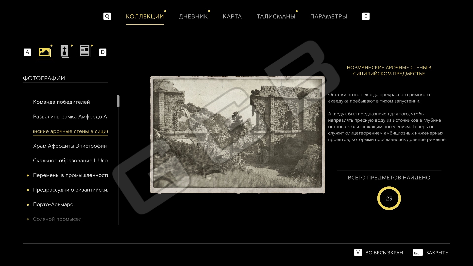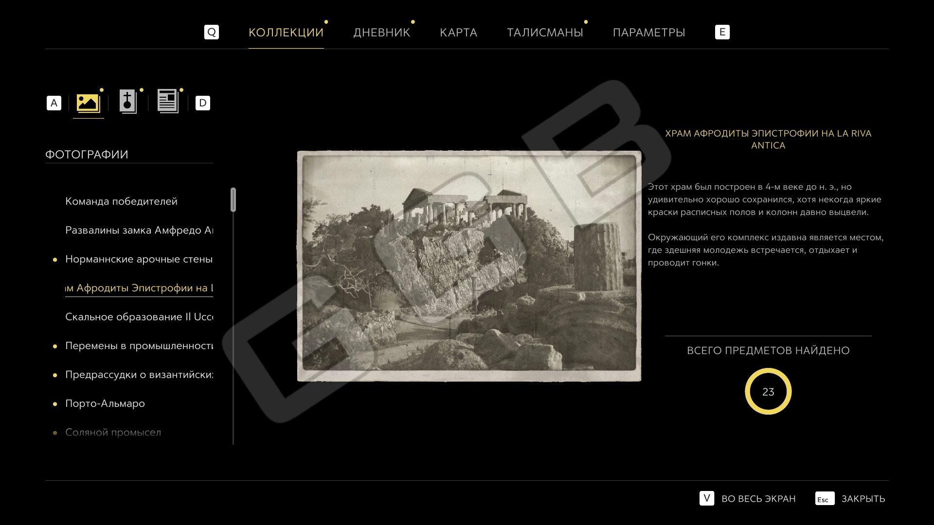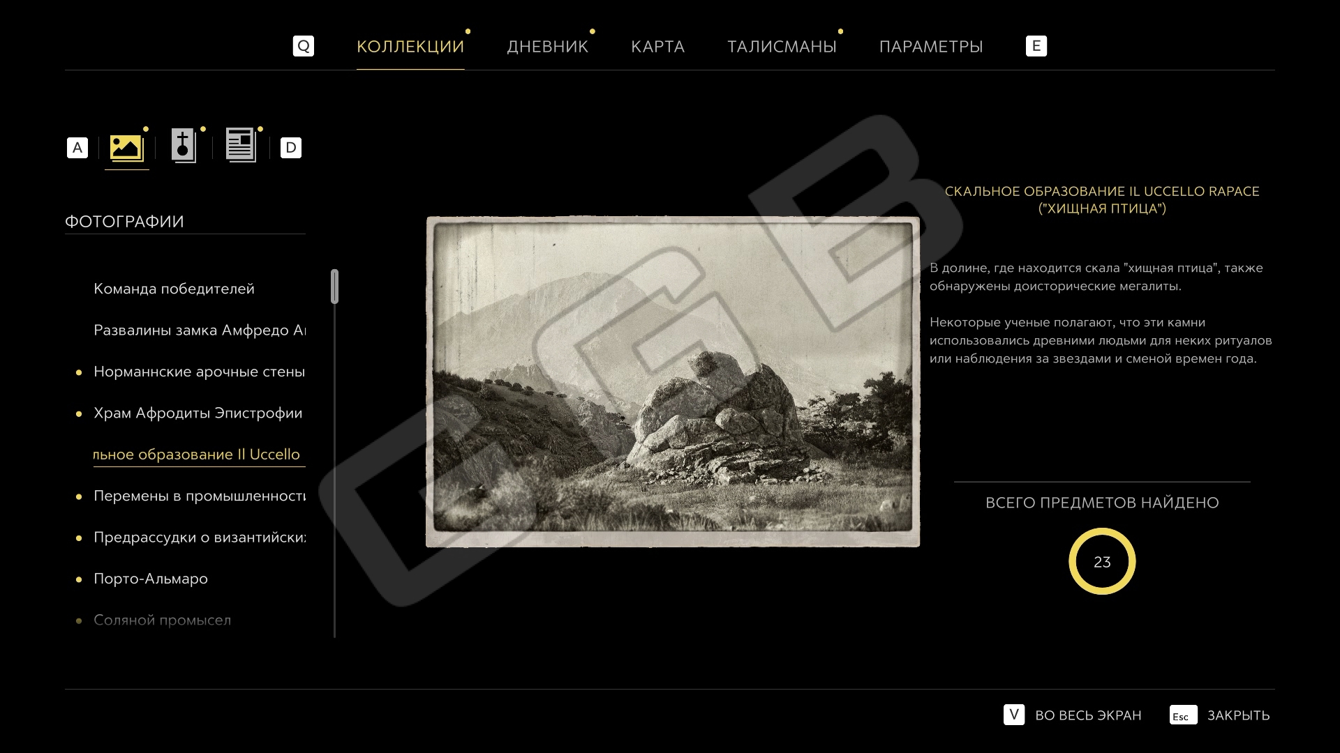 Всего в Mafia: The Old Country представлено 23 фотографии на просторах Сицилии. Собрав их все и соединив с другими коллекциями, вы получите достижение/трофей «Коллекционер» The Collector.