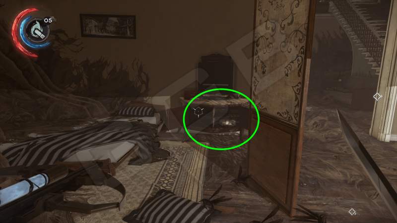 После разговора с Меган Фостер в доме, выгляните в окно, у которого она стояла. Увидите статую. Спрыгните на землю, развернитесь и перед вами будет дверь. Входите, и в комнате в поваленной тумбочке найдется руна.