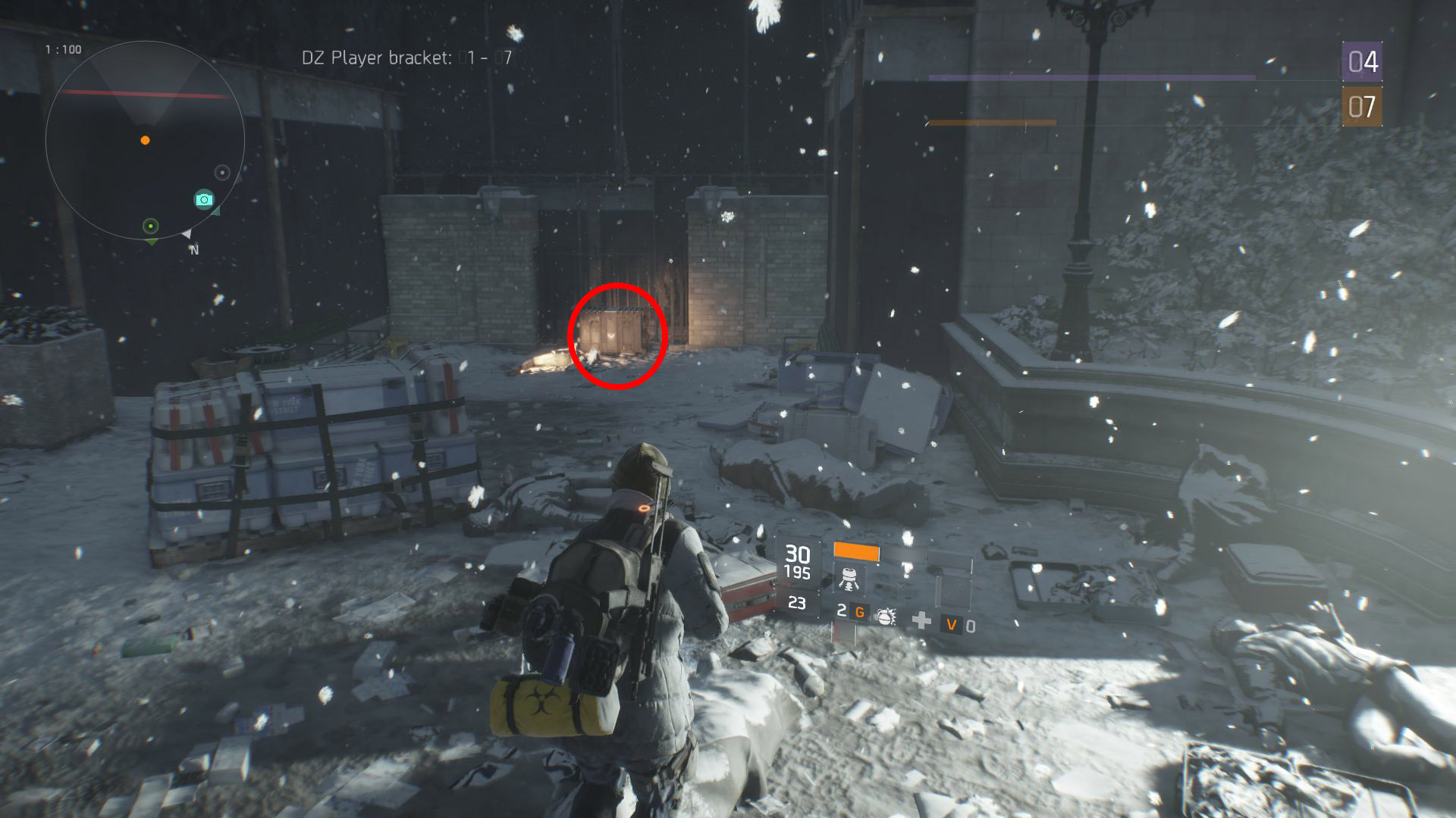 Северо-восточная часть карты. Сундук находится среди пластиковых контейнеров у ворот из проволоки.