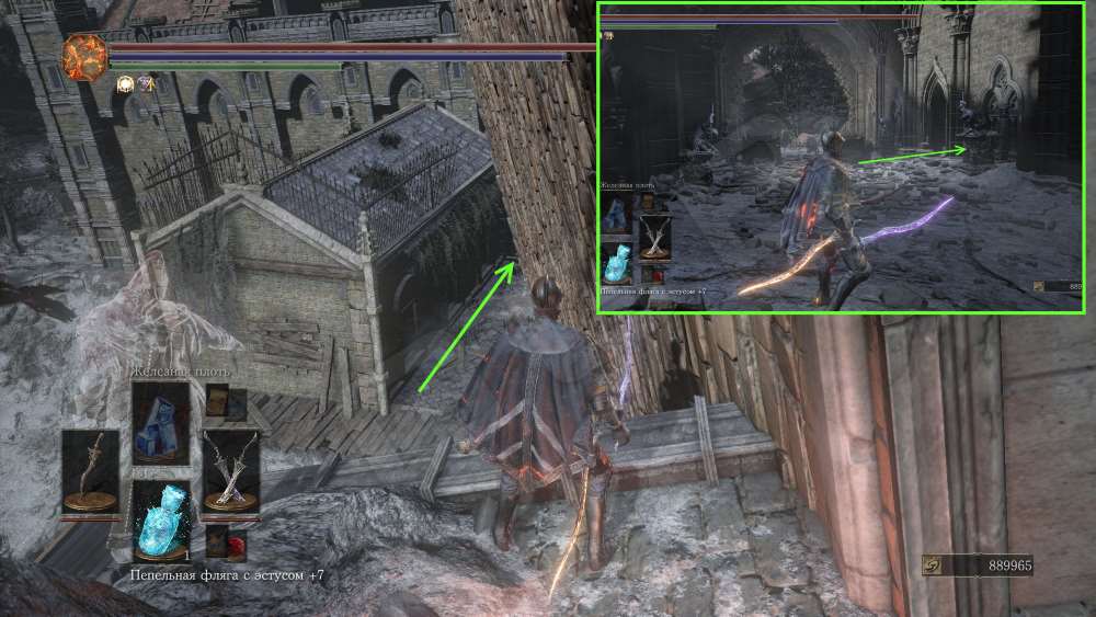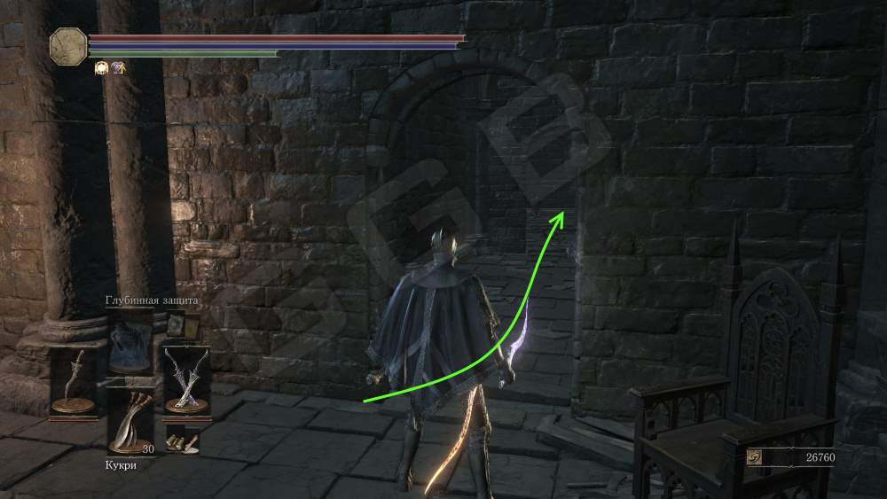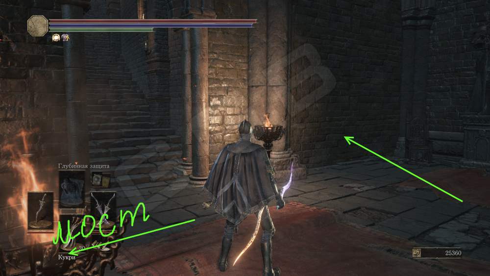 Где найти: Найти может быть сложным. Так или иначе, по сюжету вы будете в зале с двумя рыцарями, из которого пути идут: дальше по сюжету или к Лаппу. Ваша цель Лапп. Перейдите по упавшей башне, мимо Лаппа далее. Увидите небольшой мостик. Если спрыгнуть влево, то пойдете по сюжету, НО вам надо вправо с уступчика (не разобьетесь). Проходите на площадку, и справа в стене в нише найдется труп и заклинание.