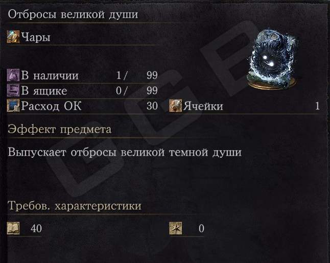 Описание: Чары, выпускающие отбросы великой темной души, что томилась в Глубинах. Для использования потребуется 40 интеллекта.