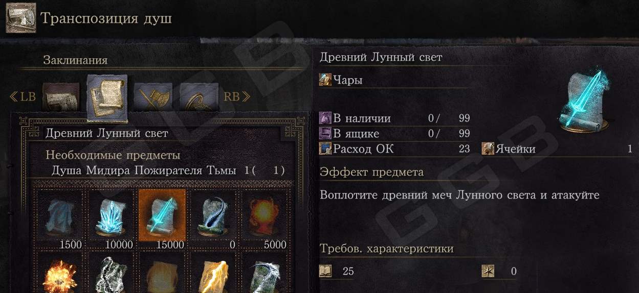 Описание: Заклинание чар, что создает меч Лунного света для битвы им. Требует 25 интеллекта.