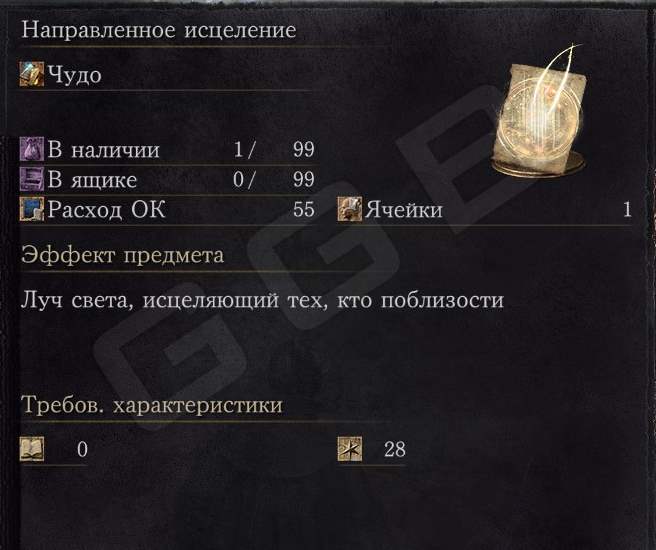 Описание: Заклинание чудес, представляющее собой луч света, что исцеляет тех, кто рядом. Для использования требуется 28 веры.