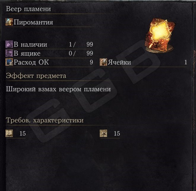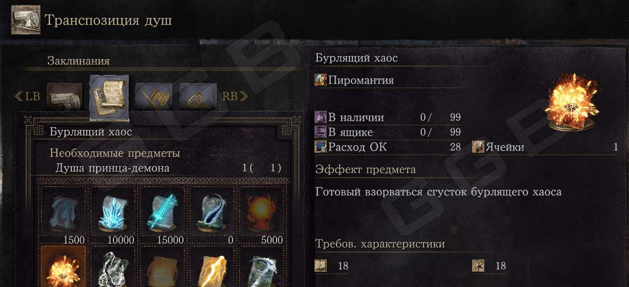 Описание: Пиромантия, что представляет собой готовый к взрыву сгусток хаоса. Оно требуется и интеллекта 18 и веры тоже 18.