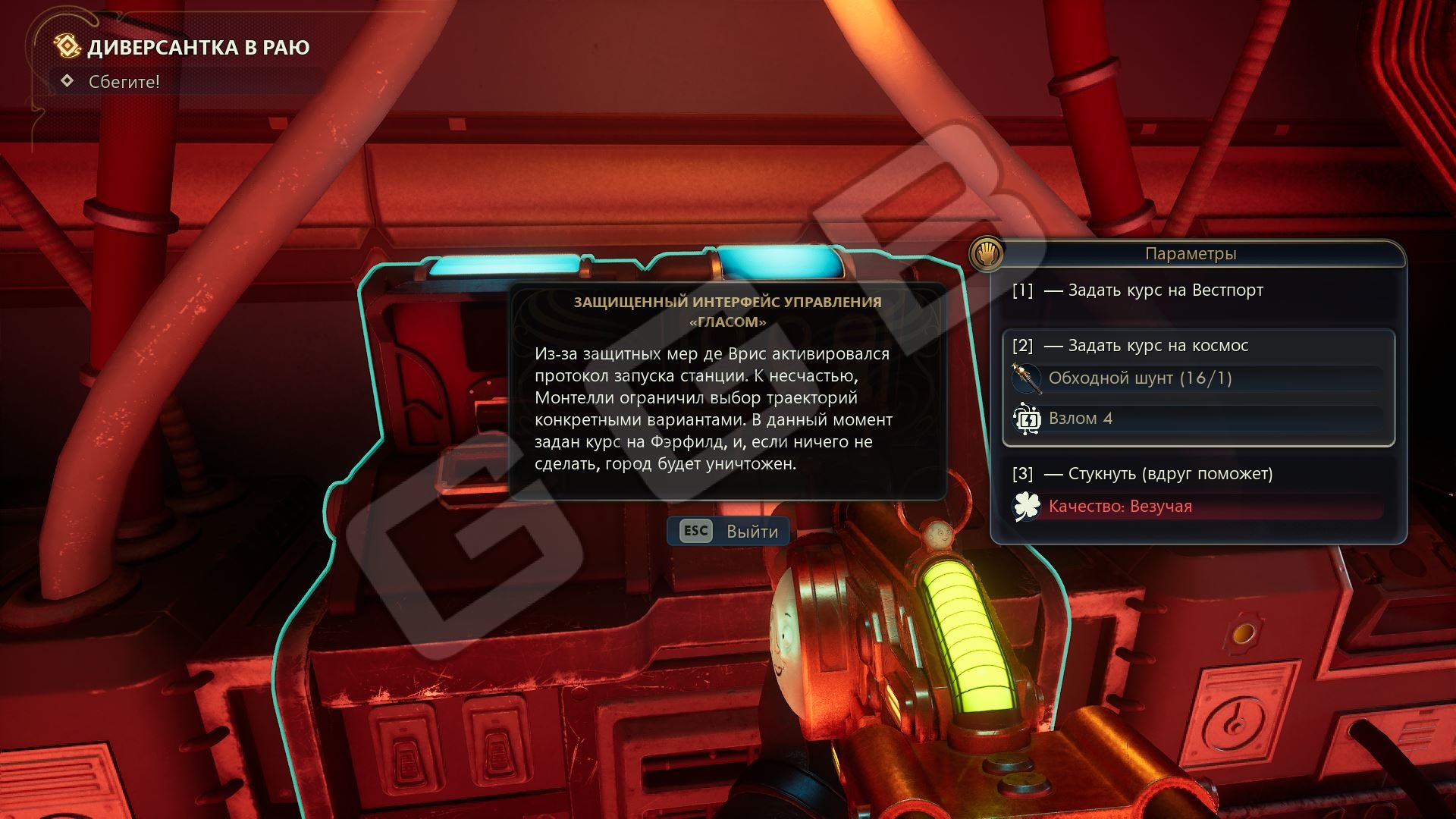 Как только вы победите генерала Монтелли на станции ретрансляции «Глас» и откопаете зашифрованное сообщение де Врис, вы активируете защитную систему, которая запустит ретранслятор в небо, и курс будет настроен на уничтожение Фэрфилда, если вы не взаимодействуете с панелью управления, чтобы изменить результат. Вы можете перенаправить траекторию на Вестпорт, и, если у вас достаточно высокие навыки Взлома или подходящая черта, вы сможете перенаправить станцию в галактику с помощью опции «отправить в космос».